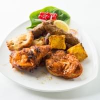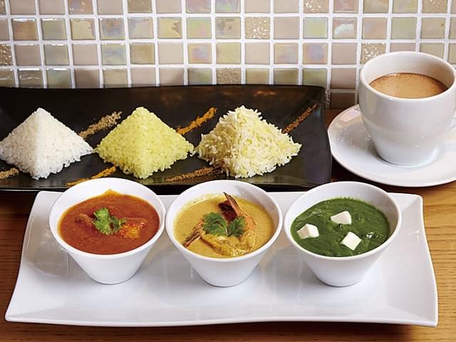 古代エジプトを象徴する、ギザの三大ピラミッドがモチーフ。ライスは、白米、サフランライス、長粒米の3種類で、それぞれチャットマサラ、ターメリックパウダー、クミンパウダーを添えました。スパイスを贅沢に使ったカリーは、チキン、エビ、ほうれん草&パニール(カッテージチーズ)の3種類。ライスとカリーの組み合わせをお楽しみください。スパイシーなミルクティー「チャイ」付き。